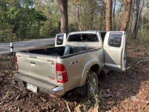 เมื่อไปถึงที่เกิดเหตุ พบรถยนต์กระบะปิคอัพ ยี่ห้อโตโยต้า ไฮลัก วีโก้ สี่ประตู สีบรอนซ์เงิน หมายเลขทะเบียน ผอ-7692 เชียงใหม่ พุ่งชนต้นไม้ข้างทาง ด้านหน้ารถติดอยู่กับต้นไม้ มีผู้ได้รับบาดเจ็บ จำนวน 3 ราย เป็นครูสาว 1 ราย นักเรียน 2 ราย เจ้าหน้าที่กู้ชีพ อบต.แม่ลาหลวง รีบนำตัวส่งรักษายังโรงพยาบาลแม่ลาน้อยเป็นการด่วน เนื่องจากผู้บาดเจ็บมีอาการสาหัส